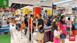 Keramaian itu membuat antrean pelanggan di kasir menjadi cukup panjang. Pelanggan terlihat membawa keranjang hingga troli berisi berbagai produk yang dijual murah berkat diskon spesial.