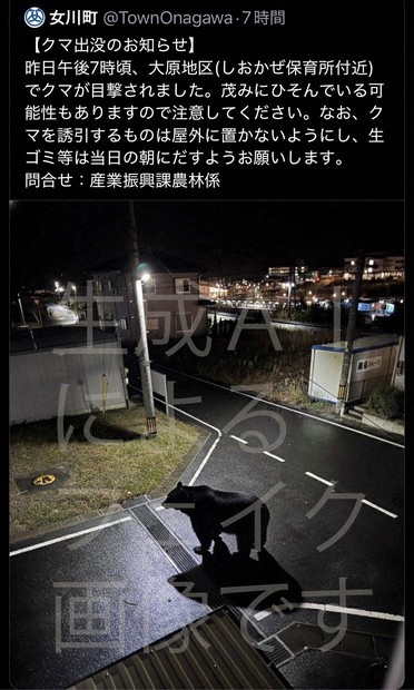 ONAGAWA, Miyagi -- The town of Onagawa in northeast Japan's Miyagi Prefecture has apologized after an image of a bear posted on an official social media account for a warning was declared to be AI-generated by its creator.