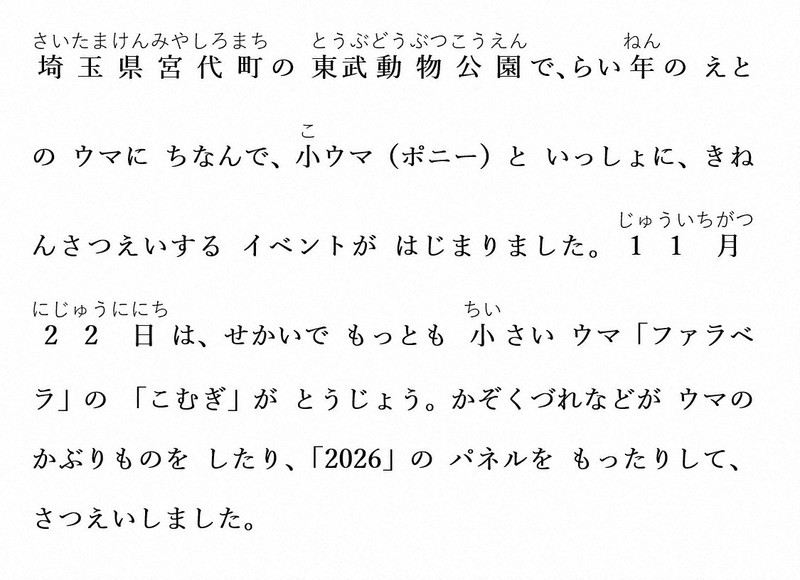 At Tobu Zoo in the town of Miyashiro, Saitama Prefecture, an event started where people can take souvenir photos with a small horse to celebrate next year's zodiac sign of the horse. On November 22, "Komugi," a Falabella -- the world's smallest horse breed -- was featured in the event. Families and others posed for photos wearing horse-themed hats and holding a "2026" sign.